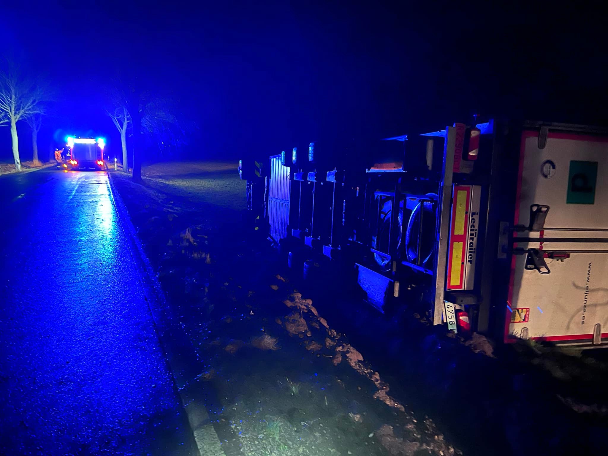 Dort angekommen fanden wir einen LKW vor, der infolge des Sturms von der Fahrbahn abgekommen war und seitlich auf das anliegende Feld gekippt war. Zum Glück wurden die beiden Insassen dabei nicht verletzt. Die Polizei hatte uns angefordert, da der Verdacht bestand, dass Betriebsstoffe ausgelaufen sein könnten und der Erdboden entsprechend verunreinigt wurde. Da auch wir dies nicht ausschließen konnten, forderten wir über unsere Leitstelle die untere Wasserbehörde (Landkreis Goslar) sowie die Kameradinnen und Kameraden aus Seesen nach.